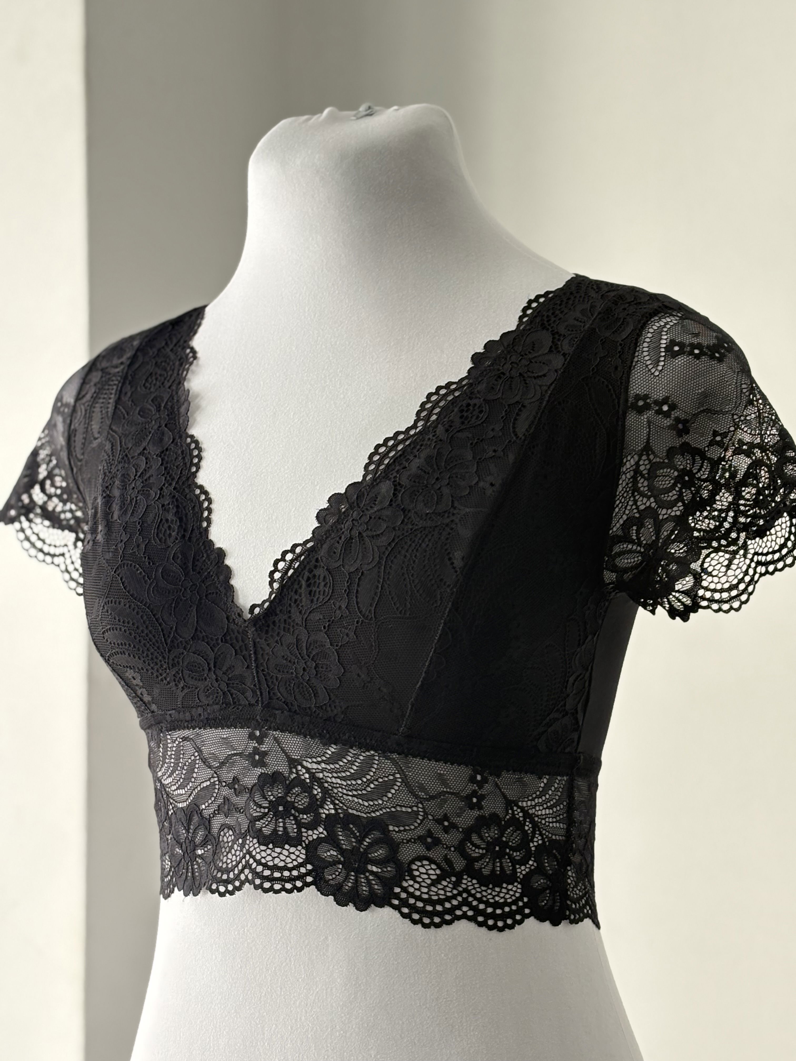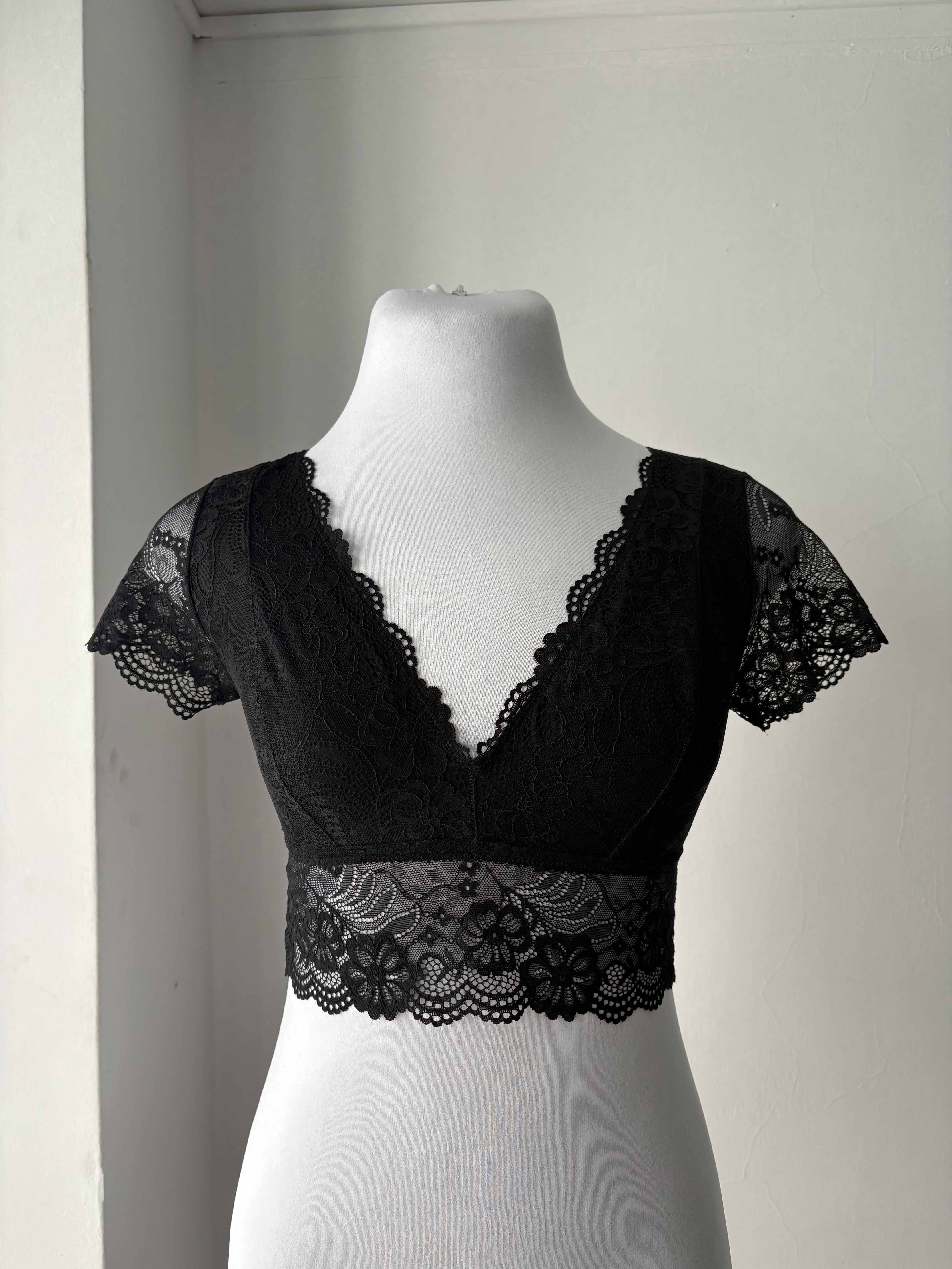 Top con manguitas, confeccionado en puntilla y lycra, 100% forrado.